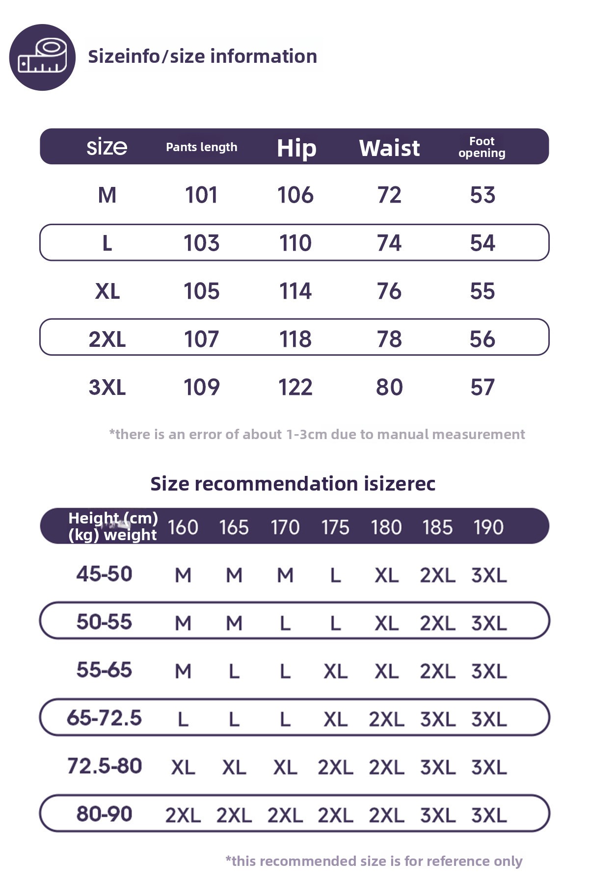 Allow 1–3cm variation due to manual measurement